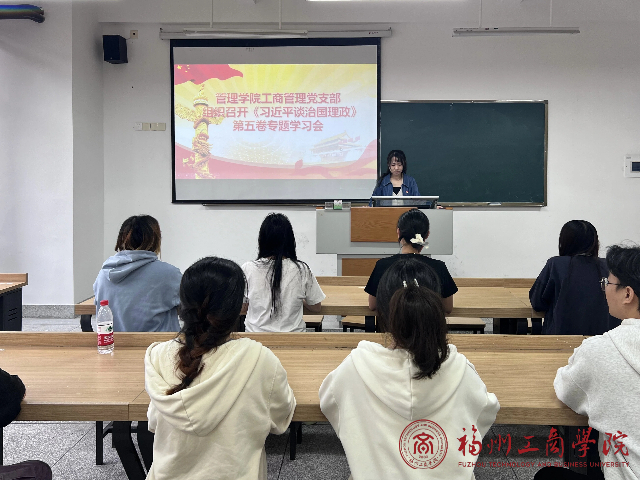 10月24日,qy球友会工商管理党支部于教学楼 B302召开专题学习会,深入学习贯彻《习近平谈治国理政》第五卷。支部书记谭音子主持会议并讲话。