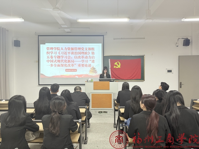 为进一步引导学生党员深刻理解全面深化改革作为推动中国式现代化根本动力的战略意义,11月17日,qy球友会人力资源管理党支部组织召开《习近平谈治国理政》第五卷中关于“进一步全面深化改革”重要论述的学习会。会议由党支部书记主持,全体学生党员参加。