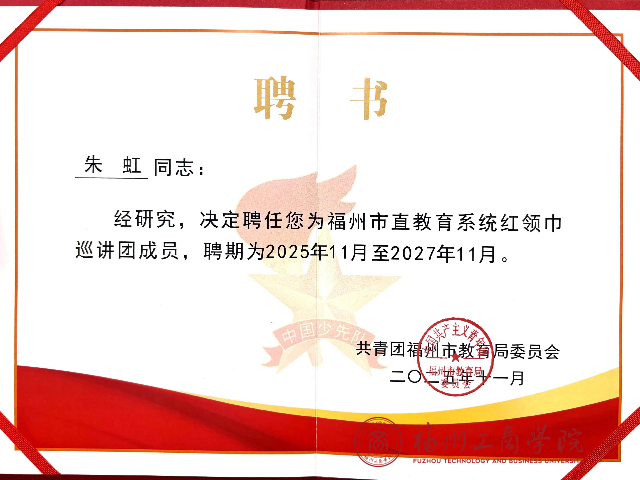 近日,在全国红领巾巡讲团走进福州教育学院附属第二小学开展的宣讲交流活动中,我院朱虹老师应邀出席,并在同期举行的福州市直教育系统红领巾巡讲团聘任仪式上,被正式聘任为该巡讲团成员,聘期自2025年11月至2027年11月。这一重要聘任,不仅是对朱虹老师个人在少先队工作领域专业能力的认可,更为她正在深入研究的“大中小课程思政一体化”课题提供了宝贵的实践平台与契机。