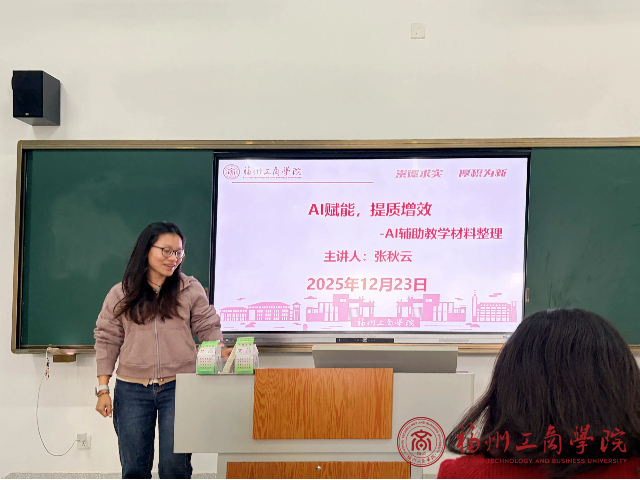 工商管理教研室主任陈颖在开场致辞中指出:“教学材料的系统化整理与高效利用一直是教学改革的重要基础。人工智能技术的介入,正推动这项工作从‘人力密集型’向‘智慧创新型’转变,为个性化教学和精准资源推送提供了可能。”此外,张秋云老师做了题为《AI赋能,提质增效》的主旨报告。她现场演示了新一代教学材料管理平台的核心功能:通过自然语言处理技术自动提取教材知识点、智能生成知识图谱;利用计算机视觉技术对历史教案、习题集进行数字化识别与分类;基于学习分析技术为不同专业、不同层次的学生推荐适配的学习资料。“传统的教学材料整理需要教师投入大量时间进行人工归类、标注和更新,”张秋云解释道,“而AI系统可以在几分钟内完成数千份材料的智能标签化处理,并持续跟踪材料使用效果,实现动态优化