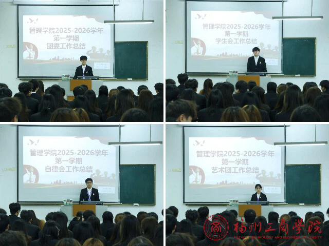 会议伊始,各团学组织负责人依次作工作总结汇报。团委副书记林嘉宏率先汇报qy球友会团委本学期工作,从团务建设、活动开展、组织协作等方面,系统梳理了团委的工作成效与待改进之处;紧接着,学生会主席陈俊楠总结学生会工作,围绕服务同学、校园活动策划、学生权益保障等核心职责,展现了学生会的履职成果;自律会主任吴博铨随后汇报自律会工作,聚焦校园纪律监督、日常管理规范等工作重点,分析了工作中的亮点与短板;艺术团负责人钟颖最后分享艺术团本学期工作,通过各类文艺活动的开展情况,展现了学院校园文化建设的鲜活成果。