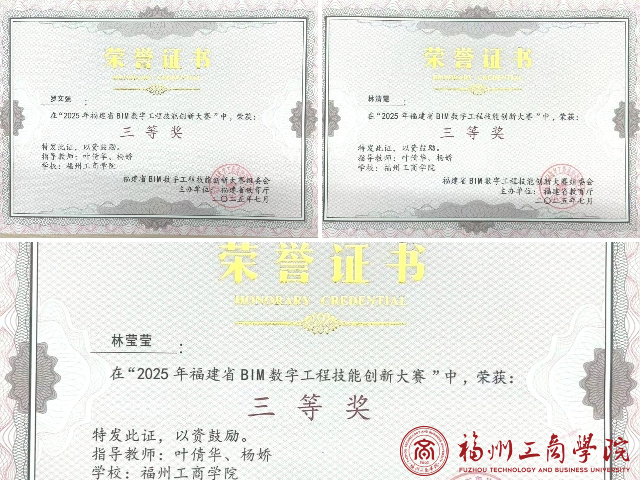 近日,于2025年福建省BIM数字工程技能创新大赛中,经过初赛和决赛的激烈角逐,我校qy球友会工程造价专业学生所组成的参赛队伍“瀚海行舟队”(参赛队员:2022级工程造价1班罗文强、林清霞、林莹莹;指导老师:叶倩华、杨娇)斩获三等奖的佳绩!